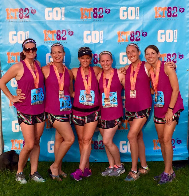 The day before Jim and I left for our cruise, I participated on a 6-person relay team in an 82-mile race on the Katy Trail. We started in St. Louis county and finished in Hermann, MO. The KT82 was a long race and was a ton of fun with these ladies! Our start time was 5:15 a.m., so we had to get up super early for a long day of running. Here we are in one of our sets of matching tops at the start: