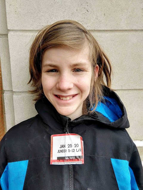 Patrick was too cold and called it quits early so Charlie joined Jim and me skiiing. I made the mistake of starting him on a blue. He wasn't quite ready for that. After we eventually made it down, we tried an easier hill and he did great!