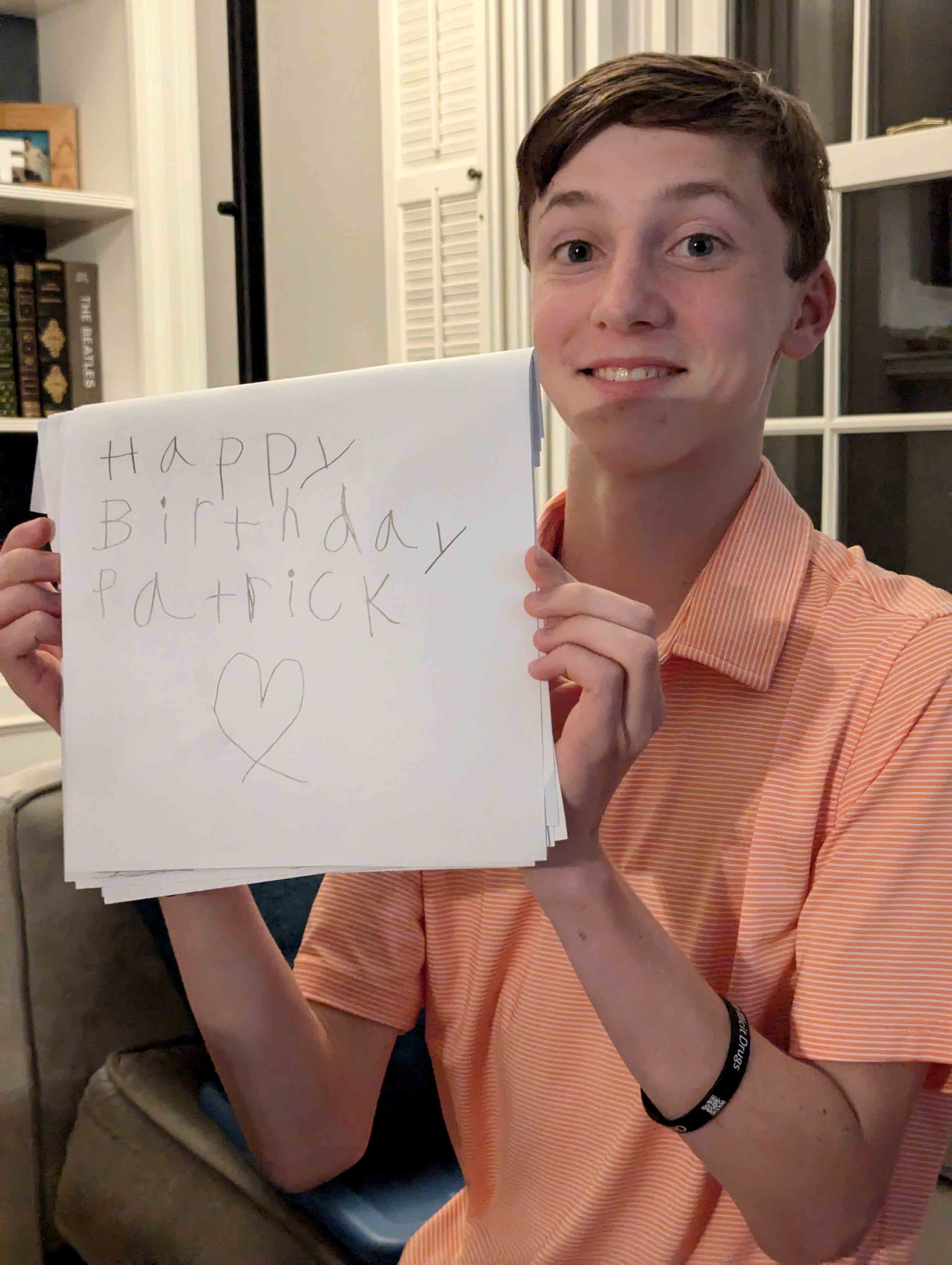 Patrick was excited to get a personalized pillow from Nana and Papa. If you squeeze it, you hear a message they recorded.